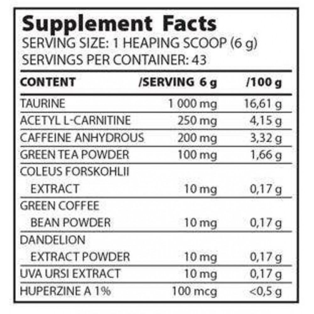 ▶️含有1000mg牛磺酸、250mg左旋肉鹼、200mg咖啡因、100mg綠茶粉和更多有助於脂肪燃燒、排出多餘水分的草本成分。